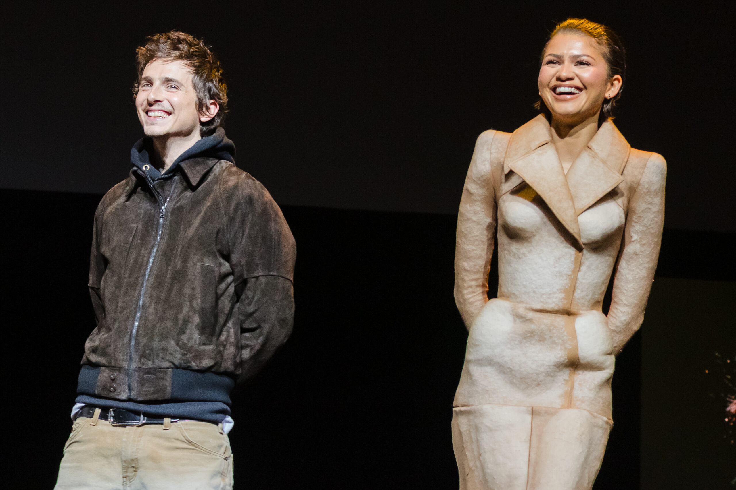 Joined by castmates Timothée Chalamet and Jason Momoa, together with director Denis Villeneuve, Zendaya took the stage on the Dolby Colosseum inside Caesars Palace, the place the ensemble echoed the sweeping desert landscapes of Dune. Her sculptural jacket, full with daring shoulders and a dramatic pointed collar, layered over a sharply tailor-made bodice, created a silhouette that felt each futuristic and regal. The tonal, sand-inspired palette and textured detailing gave the phantasm of windswept dunes in movement style assembly fantasy in probably the most elevated approach.