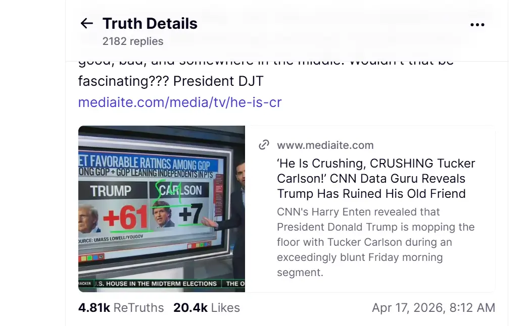 Trump shared a Mediaite article blasting Carlson’s slide, leaning on a headline that declared: “’HE IS CRUSHING, CRUSHING TUCKER CARLSON!’ CNN DATA GURU REVEALS TRUMP HAS RUINED HIS OLD FRIEND.”